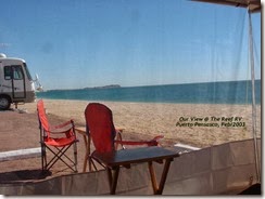 Puerto Penasco (Rocky Point) is a fishing village cum winter haven for northern tourists. In town there is one R.V. Park after another all bunched together close to the centre of town. The sites are so close, you can open your window and ask the people next to you to butter your toast. We did manage to find a park about 5 km away right on the beach. It seems not too many people had discovered it (it had only been open for about a month) and the services were limited but had everything we needed ( water, power & sewer ), ocean and beach. There were four other R.V.'s in the park when we arrived, one pulled out another one came in and we literally had a whole sandy beach to ourselves for almost the entire first week.